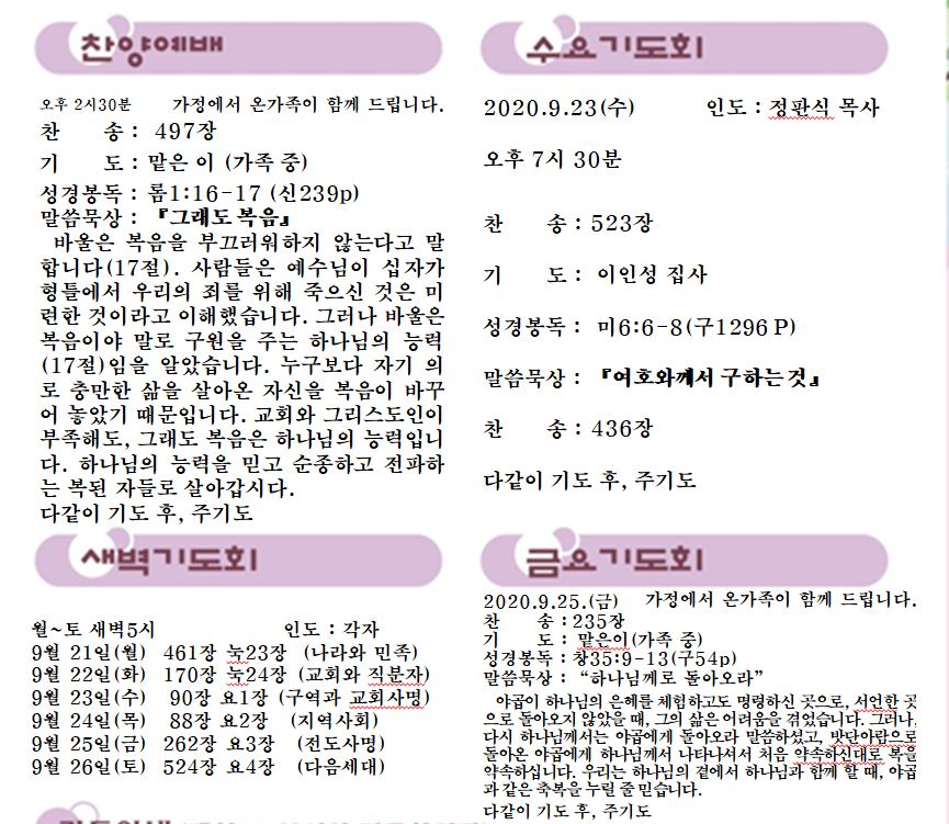 2020년 9월 20일 주중예배순서지